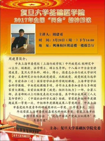 为深入学习2017年全国“两会”精神,3月20日下午,基础医学院党委特邀请全国“两会”代表、复旦大学脑科学院院长、基础医学院药理研究中心主任马兰教授和中共上海市委党校周建勇副教授作《全国“两会”专题辅导报告》。全院党员师生共计160余人聆听了报告。