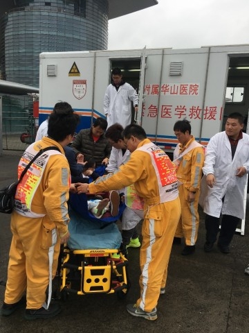 7日比赛正式打响,赛前所有医疗人员整装待命,赛道旁场地医生列队接受CMO发起的医疗巡视,所有医疗工作严格按照国际汽联标准有序开展。然而当日由于天气状况糟糕,赛场救援直升机无法起降。出于安全考虑,练习赛大部分被取消。更糟糕的是,赛事气象分析师给出的报告显示正赛当天很可能依然遭遇极端天气。而医疗救援环境若未及时得到调整,比赛很可能因此取消。毫无疑问,这将对F1中国站赛事产生极大的影响。此消息一经报道,全世界F1运动关注者的目光瞬间聚焦于医疗团队。关键时刻,作为赛事医疗主管,陈世益教授紧急召会赛事主办方、市卫计委应急办、120救护以及相关定点医院的负责人商量应对方案。经过数次及时有效的沟通,陈世益教授与国际汽联医疗代表紧急赶往备选医院进行考察。通过各方努力,瑞金北院获得最终认可并被临时选定为第二定点医院并调用华山医疗力量进行技术支持。9日的正赛因此得以正常进行。