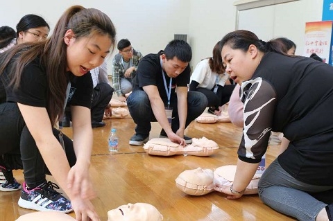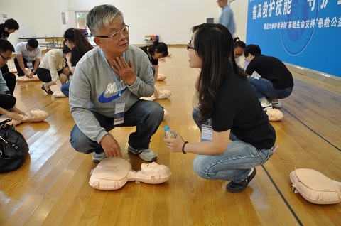 本次培训共分上下两场,第一场面向枫林街道,招募街道中小学老师、物业和地铁公司职员、游泳馆救生员、社区居委干部等公共单位从业人员,计40人;第二场面向复旦大学全体教职工,计30人。课程包括3项:心肺复苏术(CPR),自动体外除颤仪(AED)的使用,成人及儿童气道异物梗阻的急救。