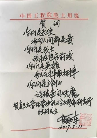 顾玉东院士即兴赋诗一首,表达了对所有医务工作者的赞许与厚望“你们是天使, 洒向人间都是爱。 你们是战士, 战斗在医疗前线。 你们是英雄, 献出才华敢拼搏。 你们是神仙, 识破世间妖魔。