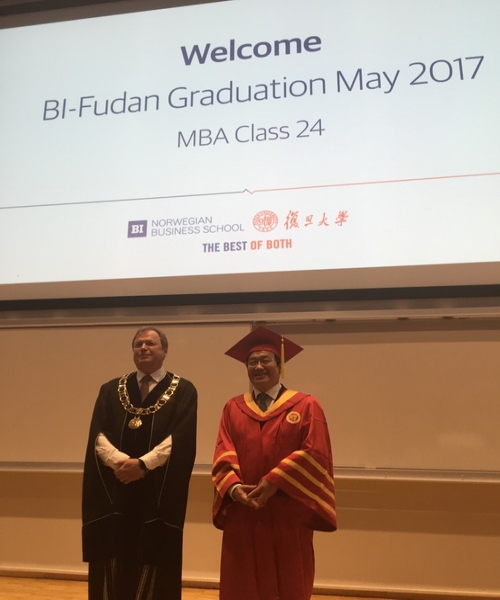 在挪威商学院校园,复旦-BI合作的MBA项目第24期学员毕业典礼举行,两校校长为毕业生颁发了毕业证书。