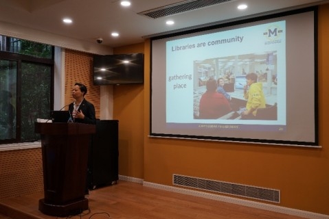 交流访问期间,Elaine副馆长给馆员和学生们作了《如何评估一个研究型图书馆的综合影响力》的精彩学术讲座。Elaine副馆长指出,馆藏量和图书馆培训的数量已经不能作为一个研究型图书馆的评定标准。图书馆需要回答的问题是:图书馆的资源、服务以及专业知识在学校教学、科研和管理中起到了哪些不同凡响的作用。总编辑Mary Francis给大家介绍一个全新的新上线的出版平台Fulcrum。学生及馆员们通过这次讲座开拓了视野,增长了知识,受益非浅。