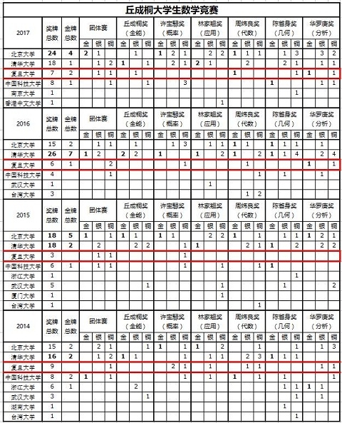 2014-2017年丘成桐大学生数学竞赛获奖情况