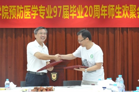 重回母校,流连在梦起步的地方,初心不忘,壮志犹存。回想当年的艰辛与快乐,他们铭记母校的恩情,更牵挂学弟学妹的学业与生活。回报母校,众校友纷纷慷慨解囊,捐款建立97届预防医学助学基金,捐资6万元用于资助学院成绩优异、生活贫困的学生。在这次的欢聚会上,校友代表阚海东与学院代表何纳教授签署了97届预防医学校友助学捐款协议。