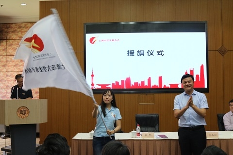 刘刚向学员代表授旗,刘博从刘刚书记手中接过挥舞的旗帜,标志着新一届上海市大学生骨干培养班扬帆启航。