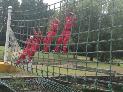 金山医院参赛队由医务部副主任、急救师资培训师周小勇带队,骨科陈方毅医师、心内科张峰医师、急诊护师杨红和朱丽共同参与完成整个赛程。比赛包括五个内容,穿越三个障碍点、完成一组现场救护,寻找象征白衣天使的南丁格尔雕像并合影,规定耗时100分钟。操作包含心肺复苏+AED操作以及创伤救护。整个赛程紧张而激烈,选手分们别进行了台风、火灾、交通事故等各种意外情境下的救护实际操作模拟技能比赛,并需穿越障碍、排除各种险情完成比赛规定任务。选手之间团结协作、互相扶持、相互鼓励,在队长的指引带领下,顺利完成各项任务。