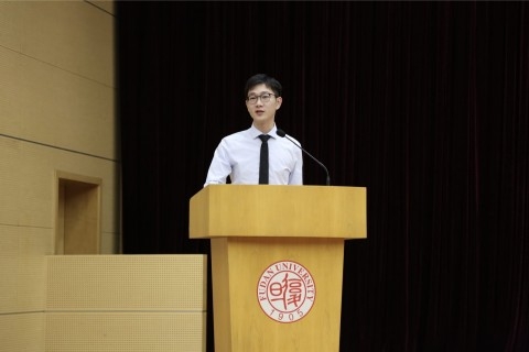 2017级法学硕士朱凌瀚作为研究生新生代表发言,他以最近火爆的“我们是谁”表情包为引子,祝愿本科新生们撇开应试的教条与桎梏,突破既定的思维模式,重新审视这充满未知的世界,去享受大学独有的、丰沛高远的思想生活。同时他期望自己和研究生新生们多与师长同仁们交流、切磋,逐渐培养良好的学术兴趣与习惯,留有充足的时间精致思考,警惕理论的形式化与空洞化。勉励大家努力成为廉洁自爱、谦诚智慧、心怀家国的法律人。