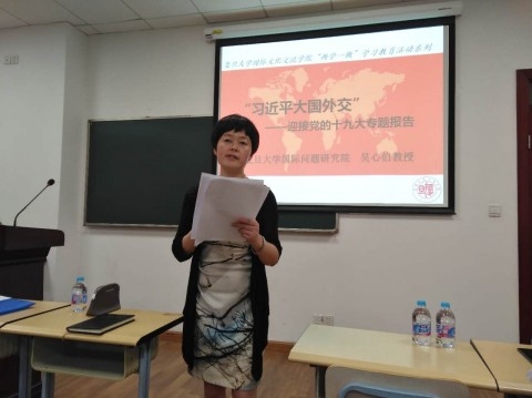 国际文化交流学院党总支为推进“两学一做”学习教育,进一步加强党员思想政治教育和形势政策教育,于2017年9月19日下午,在光华楼东主楼801会议室,举办“迎接党的十九大” 专题学习报告会,邀请我校国际问题研究院吴心伯教授主讲“习近平大国外交”。全院师生党员70余人参加了学习,活动由党总支书记王颖老师主持。