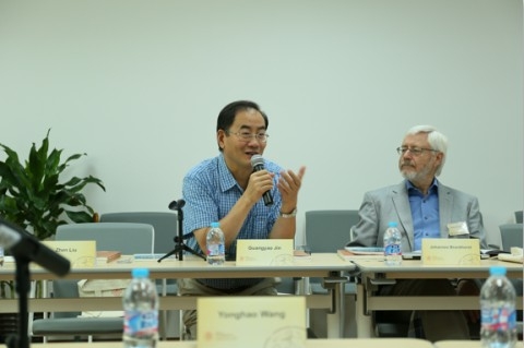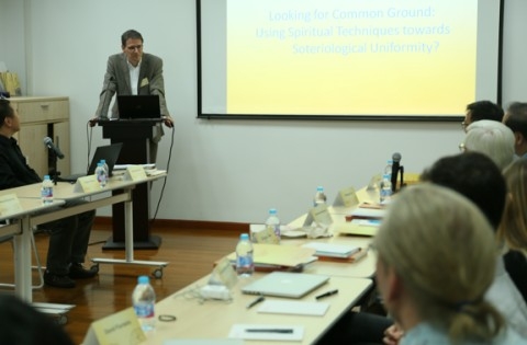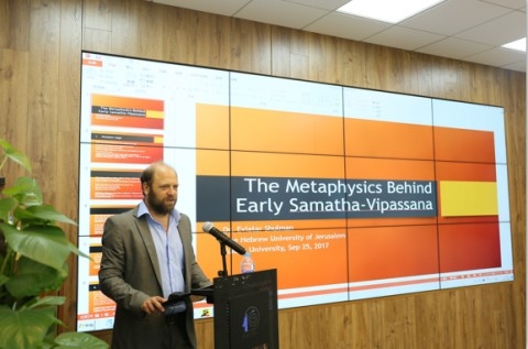 Eviatar Shulman教授,Shulman教授从佛教早期巴利文文献入手,分析了解脱之道的不同解读,探讨了“止观”传统背后的形而上学要素。报告最后回归到对佛教早期文献本质的论述并以一个问题作结:我们是否能够从佛教早期文献的编纂者那里理解佛陀本人的真实用意。在之后的讨论中,专家们热烈讨论了发言的方法论特色,文献引用与概念诠释。第二场发言的是瑞士洛桑大学的