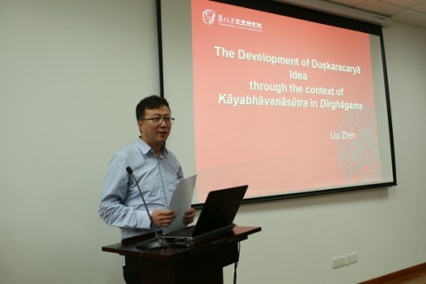 之后发言的是复旦大学甘地与印度学研究中心主任刘震教授。他主要从《长阿含•修身经》的文义分析出发,借助散落于各地、散见于各经中的一段苦行故事的各种叙述,考察佛教对于苦行观念的演变。
