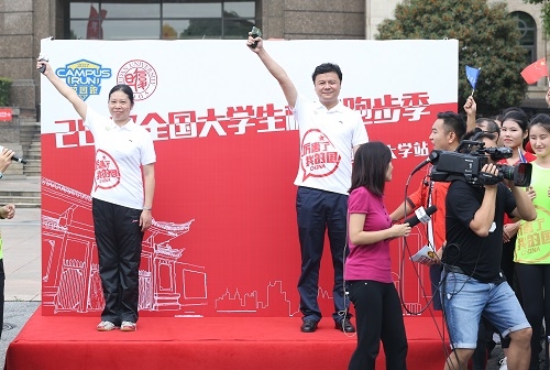 共青团上海市委副书记刘刚和党委副书记许征为活动扣动发令枪。许征在致辞中代表学校向参赛选手和广大师生致以节日的问候,希望同学们积极融入时代大潮,在实现“两个一百年”奋斗目标、实现中华民族伟大复兴的中国梦的历史进程中,携手奔跑,共谱一曲壮丽的时代乐章。