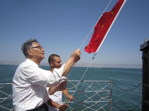 吴立德教授在以色列加利利湖上与船长一起升中国国旗