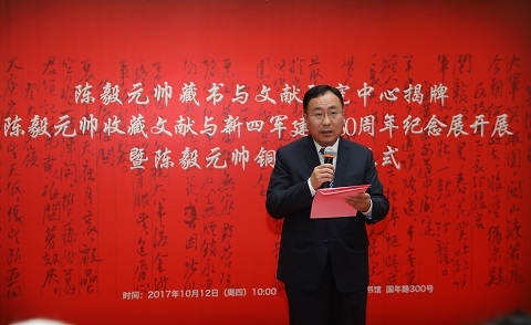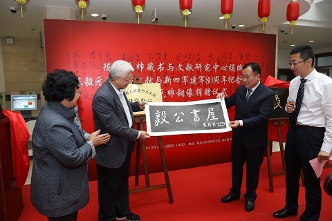 10月12日,“陈毅元帅藏书与文献研究中心”在复旦大学揭牌落成,陈毅元帅家属陈丛军女士、复旦大学常务副校长桂永浩、复旦大学图书馆馆长陈思和出席仪式并致辞,上海市委党史研究室主任徐建刚、上海市新四军历史研究会副会长陈挥等出席仪式,复旦大学校长助理苟燕楠主持仪式。当日,陈毅元帅收藏文献与新四军建军80周年纪念展开展,陈毅元帅铜像捐赠仪式举行。