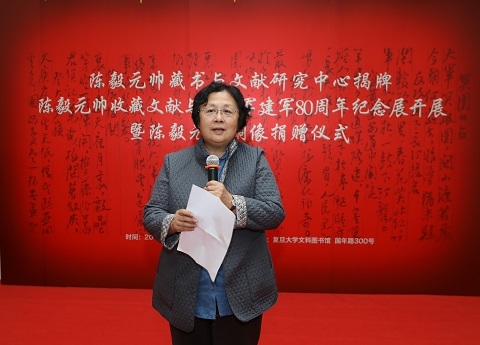 陈丛军在致辞中表示,复旦大学高度重视传承革命传统以及中国共产党党史和人物的研究工作,复旦大学图书馆为研究中心的建立做出努力,令陈毅家属十分感动。她强调,我们不仅仅研究陈毅元帅,还应以陈毅元帅为起点向外延伸扩展,研究中国共产党第一代革命家军事家的共同点和个性特点,了解他们的革命初心,只有这样,才能真正理解为什么只有共产党把中国带出了积贫积弱的半封建半殖民地的境地,取得抗日战争的胜利,建立了新中国,创造了世界上迄今为止最成功的改革开放事业,维护了中国长期的和平与繁荣,正在把国家推向全面复兴的大好局面。