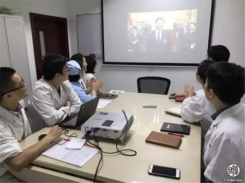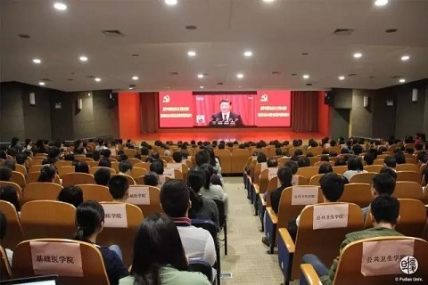 学校党委高度重视,为方便师生观看,在四校区设置转播点,在校园网开通网上转播,安排各分党委、总(直)支在保证正常教学、科研、医疗和服务工作的前提下,组织广大师生特别是党员干部收看。据不完全统计,当天上午全校近3000名师生代表,在邯郸、枫林、江湾、张江四个校区的20余个报告厅、会议室,在寝室和实验室,收看了党的十九大开幕会直播。各附属医院党委也安排了多个集中收看点,组织党员、干部聆听习近平总书记的报告。不少在海外的复旦人也通过网络进行了收看。
