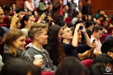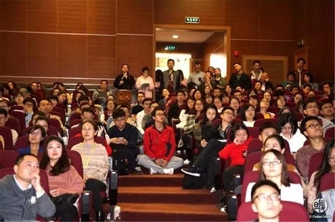 在江湾校区,廖凯原法学楼报告厅里,来自法学院、生命科学学院、先进材料实验室、环境科学与工程系的700多位师生集中收看了直播。原定的500人报告厅爆满,走廊里台阶上坐满了师生。现场立刻在智华楼301教室、先进材料楼报告厅开通视频直播,以满足不断前来收看的师生们。