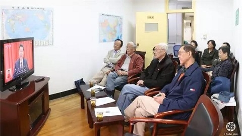 12位老干部和工作人员在复旦大学老干部活动中心,共同收看直播,聆听习近平总书记的报告。会上,老干部们时不时拿出手机来对总书记的讲话进行录像、记录。会后,大家就“新时代我国社会主要矛盾的转变”、“实现两个一百年的奋斗目标”、“全面建成小康社会”等总书记报告的重要内容进行了热烈的讨论。