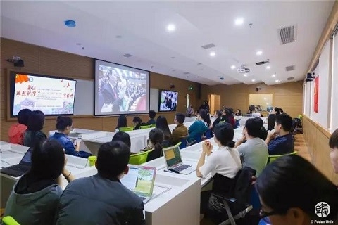 在复旦大学上海新媒体实验中心全媒体实验室,新闻学院40余位师生集中收看了党的十九大开幕盛况。现场的360度全景摄像头联网切换,实现了现场视频投射、场景同步播放,实验室还设置有两面微信互动墙,与会师生纷纷在收看过程中发送即时留言,微信墙实时滚动更新,共同分享学习心得。