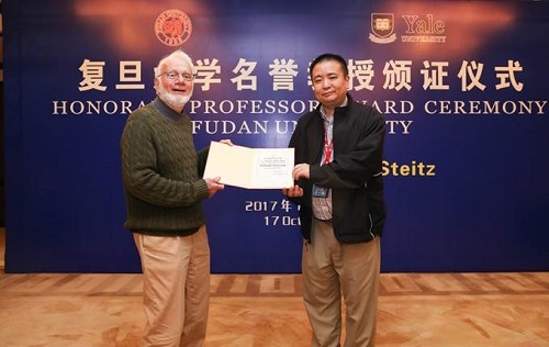 近日, 2009年诺贝尔化学奖得主、美国耶鲁大学教授托马斯•施泰茨(Thomas A. Steitz)访问复旦大学,并受聘复旦大学名誉教授。据介绍,复旦大学将和施泰茨教授在核糖体相关研究以及新型抗生素的研发方面进行战略合作,建立核糖体晶体和冷冻电镜结构生物学研究平台、新型抗生素研制开发平台。
