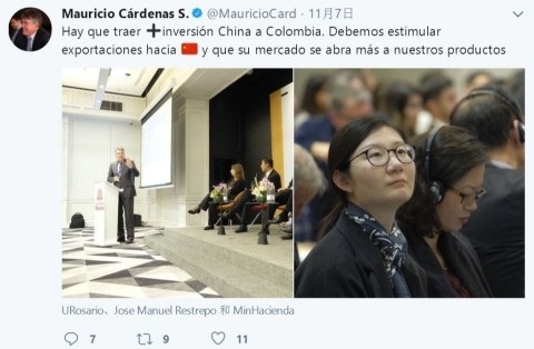哥伦比亚财政部长于11月7日更新的推特。左图为其本人,右图为复旦代表团成员。