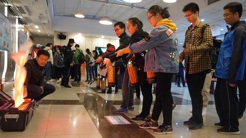 在邯郸校区,保卫处为广大新生进行了消防安全教育,通过设立了消防安全教育体验馆,模拟寝室违章电器展示及教育、灭火器操作实训以及模拟疏散逃生演练,了解违禁电器的危害,学习灭火器的正确使用。