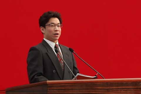 国家奖学金获得者、复旦大学信息科学与工程学院2016级硕士研究生彭博作为获奖学生代表发言