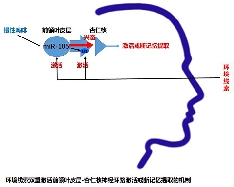 郑平课题组将吗啡成瘾鼠放在两个环境不同的盒子中,并在一个盒子中使成瘾鼠突然戒断吗啡。这时,成瘾鼠会产生痛苦的戒断症状,形成戒断记忆,并且将该记忆与其所处的环境联系到一起。以后将该鼠再放到该环境中,环境线索可以重新激活药物戒断记忆,从而表现为“逃离”这个环境。研究工作发现,当把该鼠再放到这个环境中后,环境线索可以在细胞体和神经末梢两个环节激活脑内前额叶皮层投向杏仁核的神经环路,其中在神经末梢的激活是由于多次使用吗啡引起的该处多巴胺D1受体表达增加所致。进一步的机制研究表明,该神经环路D1受体表达增加的原因是多次使用吗啡显著抑制了D1受体基因表达调控分子miR-105所致。如果上调该神经环路的miR-105可以抑制该神经环路神经末梢D1受体的表达增加,从而显著抑制环境线索对成瘾记忆的重新激活。这些结果表明环境线索双重激活脑内前额叶皮层投向杏仁核的神经环路可能是环境线索重新激活药物戒断记忆的重要神经机制,干预此过程可能是减少环境因素导致药物复吸的新策略。