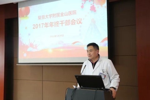 陈刚在总结报告中以“拥抱新时代 要有新作为”为引子,提出了新一年的医院设想,在学科建设方面要有新思路,作好规划与顶层设计,有创新意识。在推动学科建设的方向上,他代表院领导班子首推肿瘤学科建设,由肿瘤科牵头,以点带面,集约放疗科、肿瘤内科、血液科、介入科,开展肿瘤的综合治疗,在此基础上发展亚专科,做大做强学科,成为肿瘤临床医学科,造福更多的患者。其次,手术科室开展微创手术,与兄弟医院并驾齐驱,共同发展。与此同时,引进人才,更要留住人才,在学科带头人的引领下,培养年轻人,形成学习新知识、新技能和新技术的氛围,打造品牌学科,为医院的后续发展作好人才、技术层面的铺垫,为医院的发展增添强有力的支撑与动力。最后,他以“天道酬勤、日新月异”的观念鼓励大家,以“逢山开路、遇水搭桥”的精神鼓舞大家,以“幸福都是奋斗出来的”号召全体与会人员,齐心协力,为金山医院的美好明天而奋斗。