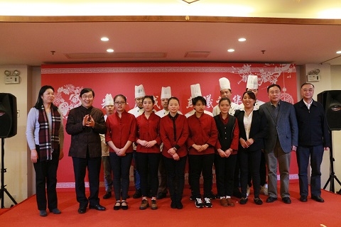 最后,全体厨师和服务员们登台亮相,校领导和他们亲切握手致谢并合影留念。云南省永平县是复旦大学定点帮扶地区,校领导同时也为部分在复旦后勤部门实习锻炼的永平员工送上了节日祝福。
