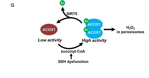 在论文中,叶丹团队报道SIRT5蛋白除了定位于细胞核、细胞质和线粒体,还通过其N端过氧化物酶体定位信号PTS2定位于过氧化物酶体。在SIRT5敲低细胞系中,细胞核、线粒体、过氧化物酶体亚细胞水平的过氧化氢(H2O2)产生显著上升,这与SIRT5敲低导致过氧化物酶体中H2O2产生关键代谢酶ACOX1的琥珀酰化增加,促进具高活性的ACOX1二聚体形成相关。换言之,SIRT5通过去琥珀酰化修饰抑制H2O2产生相关代谢酶ACOX1活性,降低胞内H2O2生成,为解析SIRT5如何在细胞抗氧化过程中发挥作用提供了新机制。