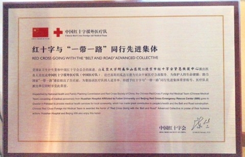 近日,中国红十字会第十届理事会第四次会议在北京举行。由复旦大学附属华山医院和北京市红十字会紧急救援中心医务人员组成的驻巴基斯坦瓜达尔港中国红十字援外医疗队荣获“红十字与‘一带一路’同行”先进集体称号,附属华山医院副院长靳建平代表医院从中国红会党组书记、常务副会长徐科手上接过奖牌。
