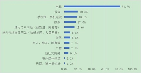 调查结果显示,电视是受访者了解“两会”信息的最主要渠道,选择比例达到81.8%,其次为微信(19.8%),排在第三位的是手机报、手机电视(18.6%)。