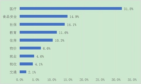 在民生议题中,受访者最为关心的三大问题分别为医疗问题(31.8%)、食品安全问题(14.9%)和社保问题(14.1%)。教育问题(11.6%)和住房问题(10.3%)排在第四、第五位。