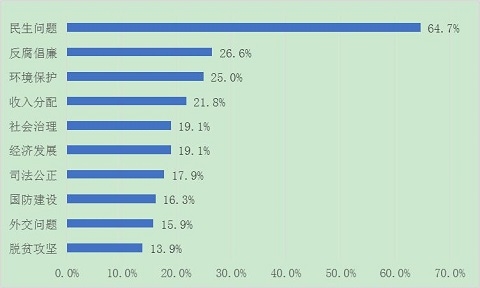 调查结果显示,受访者最关注的“两会”议题依次是“民生问题”(64.7%)、“反腐倡廉”(26.6%)和“环境保护”(25.0%)。此外,“收入分配”(21.8%)和社会治理(19.1%)等议题也受到较高关注。