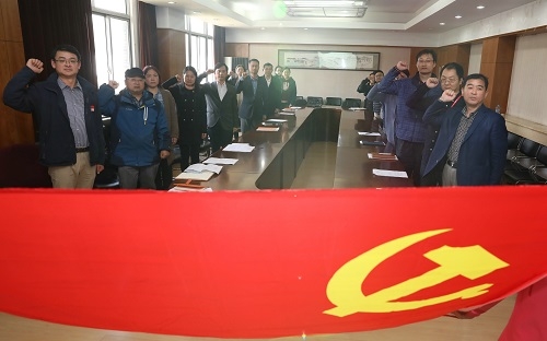 曾经陪伴钟扬同志最后一程的那面党旗高高地悬挂在会议室里。全体党员面对光辉的党旗庄重肃立,举起右手,握紧拳头,由徐阳同志领誓,重温了入党誓词。在整齐庄严的宣誓声中,共产党员的光荣、使命与担当在同志们心中激荡,争做“钟扬式”党员的行动已经起航。