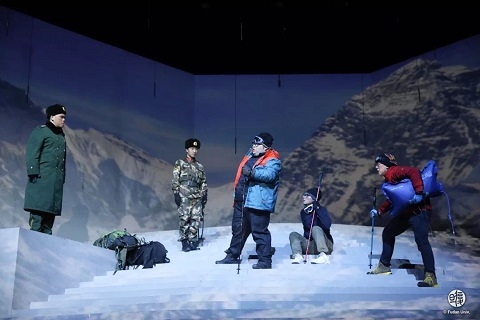 一句呼喊,将观众带入由灯光舞美创造的漫天飞雪里。这是串联起这部剧的9场戏之一,讲述钟扬带着他在西藏大学的学生,于海拔6000余米的珠穆朗玛峰北坡采集高山雪莲。舞台上,演员的艰难喘息和蹒跚步伐,再一次展现了一个胸怀理想、不畏险阻的钟扬。