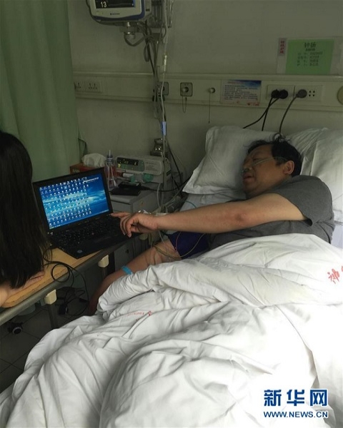 钟扬教授在病房与同事交接工作(2015年资料照片 新华社发 复旦大学/供)