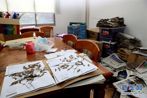 在复旦大学钟扬的工作间里,大量报纸中夹存着他和团队从各地采集的待整理植物标本(新华社记者 2018年1月24日 刘颖/摄)