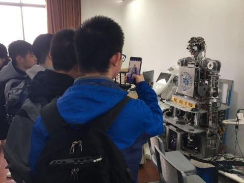 参观环节中,在学院学生会志愿者们的带领下,同学们前往各个实验室进行亲身体验。在交互式图形学实验室中,同学们体验了实验室自主设计的射击游戏。在智能机器人研究实验室中,实验室研究生演示了与智能机器人的互动过程,从询问天气、播放音乐,到根据指令前后移动,“复旦一号”机器人都完美完成了任务,甚至还能和大家聊天、开玩笑。在计算机科创实践站展示厅中,同学们尝试了各种各样的体感游戏和VR游戏,亲身体验了新兴的设备和技术。此外,同学们还参观了数据界研究室(大数据展示厅)、上海视频技术与系统工程研究中心、电子商务研究中心等实验室。
