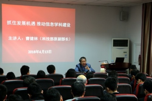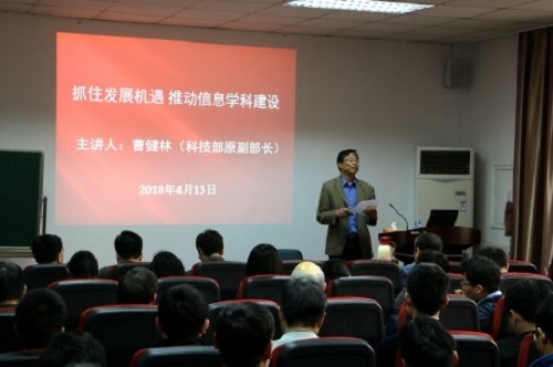 曹健林教授作了题为《抓住发展机遇,推动信息学科建设》的报告,分析了信息学科建设所面临的机遇与挑战。他指出,“新时代”下站在历史的新起点,各行各业都有了新的目标和新的要求。他提出,希望中国能够在两个主要方面实现从跟跑走向领跑:一个是在基础研究方面,希望中国能够提出新的观点和新的方法,并通过这些新的观点和方法,总结出新的原理,甚至是颠覆性的原理;另一个是在应用研究方面,他希望中国可以在新的技术领域不断发展,并走到世界的前列。