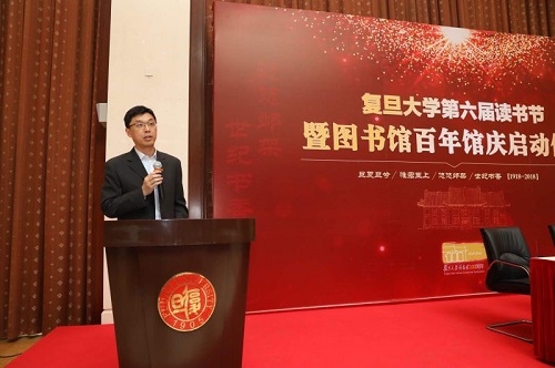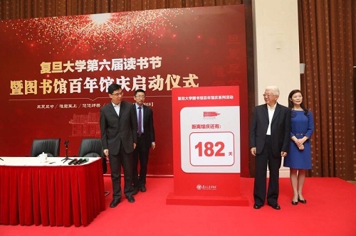 复旦大学党委副书记刘承功,复旦大学校友、中国银行上海分行行长赵蓉在仪式上致辞,并对图书馆百年馆庆启动表示热烈祝贺。复旦大学图书馆馆长陈思和介绍了图书馆百年馆庆系列活动的安排和基本情况。刘承功、校长助理苟燕楠、陈思和与赵蓉为馆庆日倒计时牌揭幕。嘉宾还为2017年度复旦大学“阅读达人”和图书馆优秀志愿者颁奖。