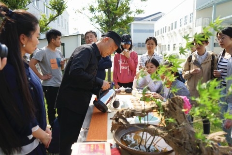 随后,李辉和茶艺师们带领学生从茶道理论走入实践,在户外细品佳茗,让他们亲身体会茶香以及其背后的文化雅韵。在初夏的暖阳,与不同茶香交织的香雾中,复旦学子三三两两地围在室外的原木桌上品茶交谈。李辉还特意拿出按古法自制的黄茶和少见的黑陶茶壶与大家分享,从科学的角度解读黄茶的成分和其带来的健康意义,也同时将器物的材质与茶种的关系出发,讲解如何最大化地发挥茶的健康功效。