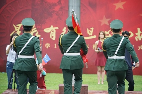 随着最后一位传旗手、外国语言文学学院教师卢丽安在校训墙前接过国旗,与武警班国旗护旗方阵在国旗坪前汇合。两队人马交接国旗后,国旗班同学出旗。国歌响起,国旗冉冉升起,大家唱起国歌,向国旗行注目礼。
