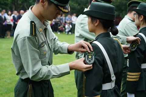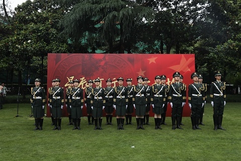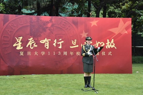 在的国旗红之间,有两支橄榄绿的队伍格外引人注目。一支队伍是来自武警国旗班的升旗仪式旗手方阵,他们是校园内一道靓丽的风景线。另一支是复旦大学国旗护卫队,这支年轻的队伍由 17 名男生、14 名女生组成,包括 10 名武警班学生与 21 名非武警班本科生,本次升旗仪式是他们的第一次亮相。在飘扬的国旗下,武警国旗班为国旗护卫队授臂章,这是复旦“团结、服务、牺牲”精神的传承,也是复旦青年爱国荣校信仰的传承。
