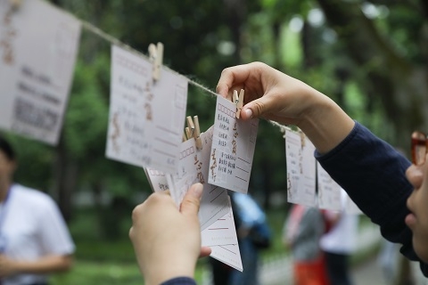 还未到六点,参加校庆升旗仪式的师生校友已陆续来到恒隆物理楼前的国旗坪附近。飘着细雨的天气并未阻挡大家的热情,不少人手中拿着校旗、国旗,或是在校庆背景板前合影,或是拍下路边悬挂的校庆明信片祝福,等待升旗仪式的开始。