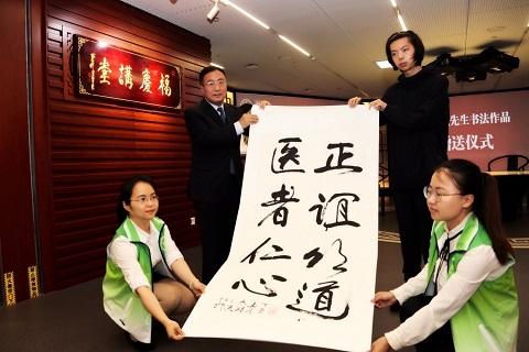 仪式上,著名雕塑家、书法家钱绍武先生去年90岁高龄时为上海医学院创建90周年创作的书法作品《正谊明道 医者仁心》由其孙钱进赠予上海医学院,桂永浩代表学校受赠并颁发捐赠证书;为感谢复旦大学陈灏珠院士医学发展基金10年来持之以恒的支持,许征代表学校向陈灏珠院士的女儿陈芸颁发致谢证书;上海海派书画院顾问郑孝同代表与会的艺术家发言,阐述了他们眼中的医学和艺术,表达了他们未来的期许和行动。