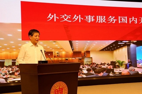5月29日,外交部“外交外事知识进高校”活动走进复旦大学。外交部外事管理司司长廖力强、外交部领事司副司长魏晓东、外交部边界与海洋事务代表周健分别就外交外事服务国内开放发展、新时代领事工作形势与任务、边界与海洋事务,结合典型外交案例为复旦师生作报告。上海市外办负责人、复旦大学副校长陈志敏及各学院师生等400余人出席报告会。
