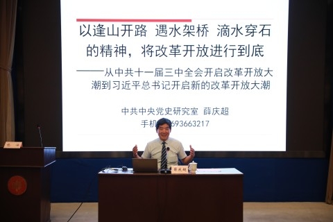 薛庆超在题为《以逢山开路、遇水架桥、滴水穿石精神将改革开放进行到底——从中共十一届三中全会开启改革开放大潮到习近平总书记开启改革开放第四次大潮》的报告中,描绘了改革开放40年波澜壮阔的历史进程,呈现了改革开放和新时代中国特色社会主义的历史关联,阐释了改革开放40年的历史定位和新时代中国特色社会主义的历史方位,展现了改革开放实事求是、与时俱进、开拓创新的时代精神。