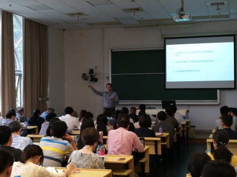 陈重周的演讲让听众们了解了传统教学模式相比在线教育的优势以及今后发展的方向和趋势,特别是新技术在教育数据挖掘方面独具优势给大家留下了深刻的印象,这使得及时、如实地了解、掌握学生的学习情况成为可能,从而为实施个性化教学提供有力支撑,为改进教学提供了重要的和必要的前提。值得一提的是,本次讲座也采用了“翻转”的模式,讲座中穿插进行了关于多媒体教学研究的交流、讨论。4-5个邻座的与会教师根据相关主题,组成一组开展讨论,然后由各组推举代表发言。大家结合自身的实践特别就如何充分利用在线教育技术提高中学物理教学质量的问题进行了充分交流。