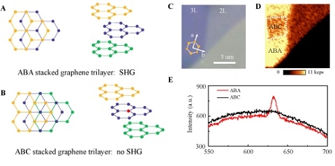 (A)和(B):ABA和ABC堆叠结构的三层石墨烯原子结构示意图。前者是中心反演对称破缺的,有二次谐波(SHG)。而后者是中心反演对称的,图上的红色圆点为中心反演对称点。